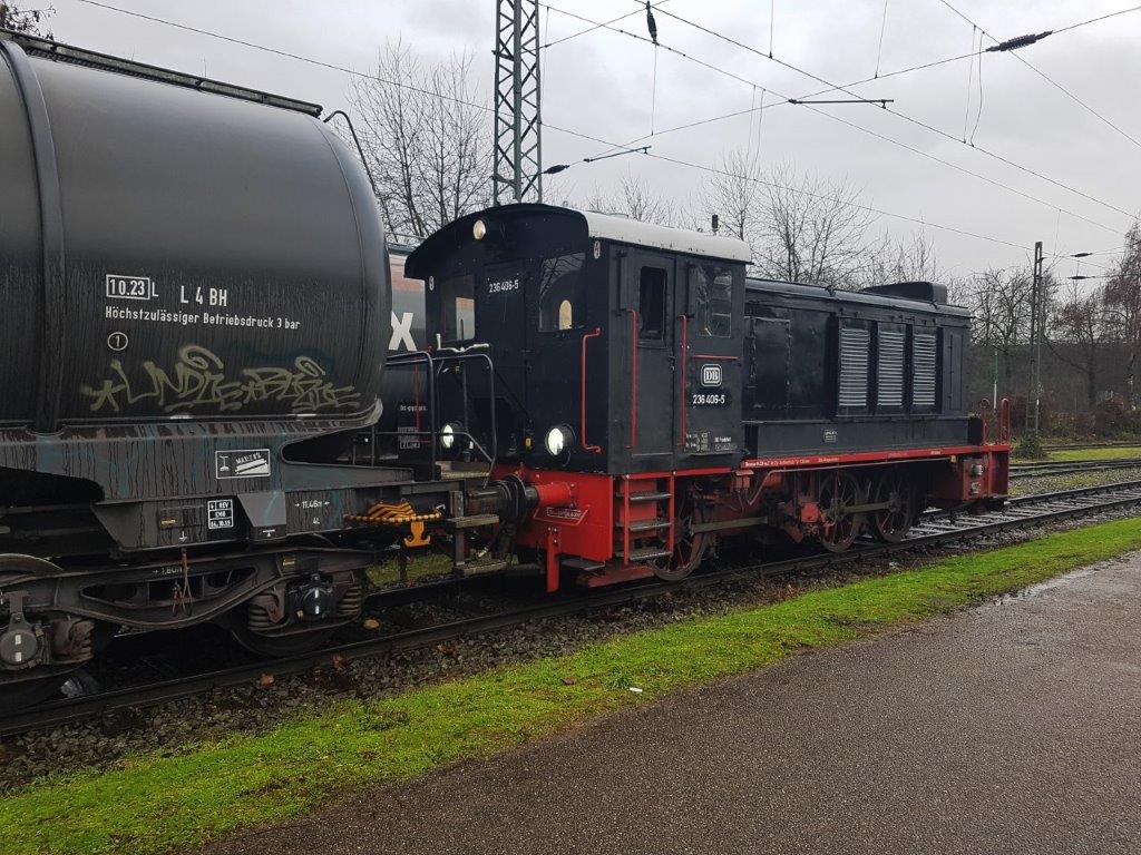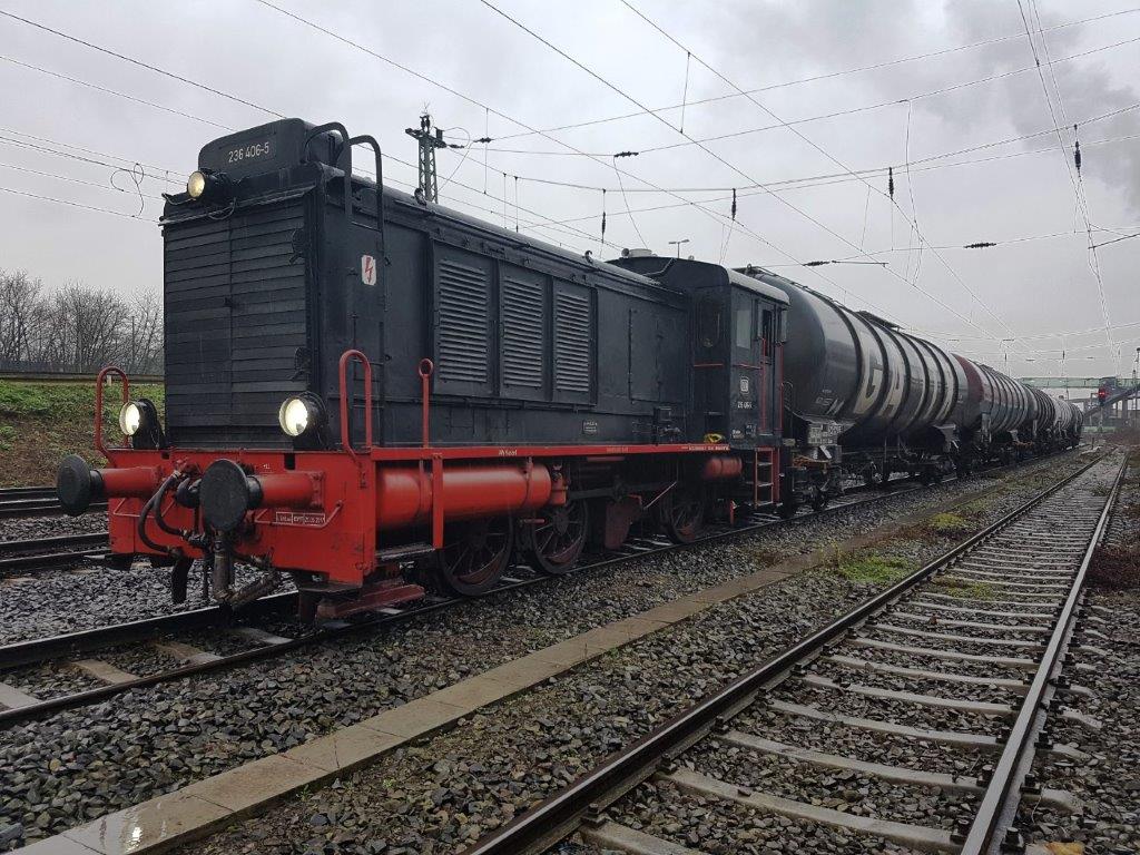 Am 20.12.2019 kam dann die Belastungsprobe. Wir mussten einen etwa 2000 Tonnen schweren beladenen Kesselwagenzug wieder in den mit Fahrdraht überspannten-DB-Teil umrangieren. Aufgrund des Dauerregens an diesem Tag, und der schleppenden Beladung dauerte die Aktion einen halben Tag zumal aus Witterungsgründen immer nur 6 volle Wagen gleichzeitig umgesetzt werden konnten. Unsere 236 406-5 hat diese Rangierleistungen mit Bravour erledigt und fast fühlte man sich in alte DB-Zeiten versetzt.