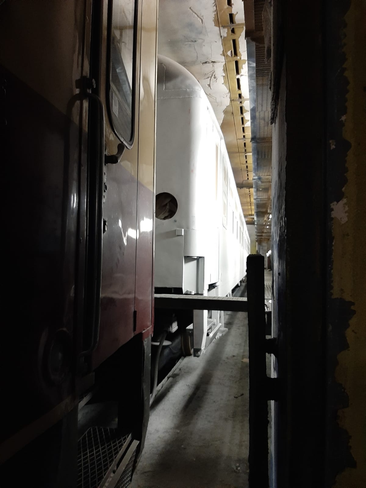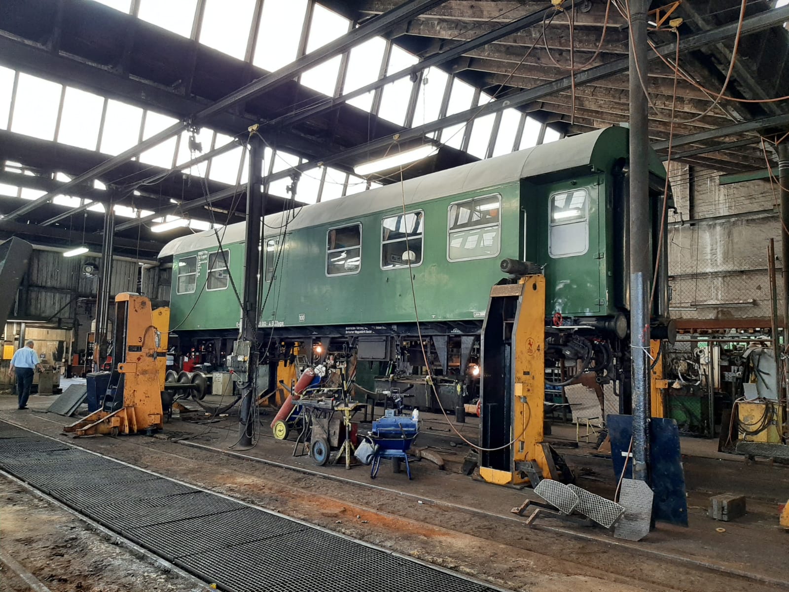Auf den nächsten Aufnahme sieht man einen unserer Reisezugwaggons des Typs Bm234 (im Hintergrund in weiß). Dieser Waggon erhält nicht nur eine neue Hauptuntersuchung (HU), sondern wird auch äußerlich komplett neu aufgearbeitet. Die Blecharbeiten sind abgeschlossen und der Waggon ist mit weißer Grundierung überzogen. Anschließend wird er lackiert. Die Aufarbeitung war nur möglich, weil sich ein Großspender gefunden hatte. Dem Spender an dieser Stelle noch einmal ein herzliches Dankeschön!