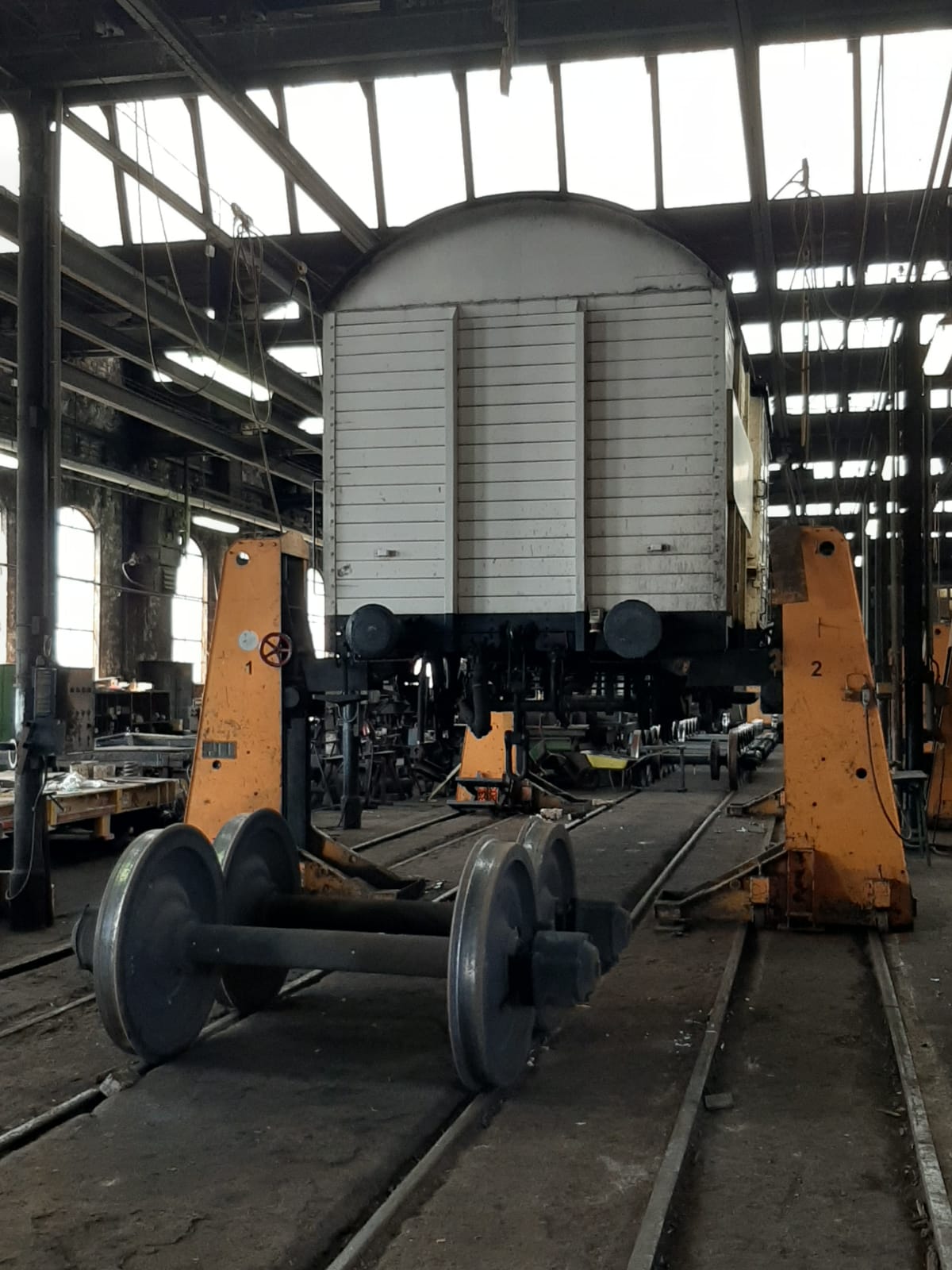 Auf den anderen Fotos ist der Dreiachser des Typs 3Yg (Umbauwagen) abgebildet, den die HEF als Buffetwaggon nutzt. Auch er erhält eine Hauptuntersuchung (HU). Die drei Achsen sind die des Fahrzeugs. Wenn man genau hinschaut, kann man mit bloßem Auge die Flachstellen entdecken, die dem Fahrzeug zuletzt zu schaffen gemacht hatten. Die Radreifen sind also noch nicht abgedreht, dies erfolgt aber noch. Darüber hinaus sind die Achsen aber in einem recht ordentlichen Zustand. Die Befürchtung eines eventuell notwendigen kompletten Achsentauschs hat sich Gottlob nicht bewahrheitet. Denn das wäre aus finanziellen Erwägungen das Ende des Waggon gewesen. Aufgrund regulatorischer und betrieblicher Anforderungen muss die mittelfristige Zukunft des Waggons dennoch leider offen bleiben.