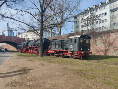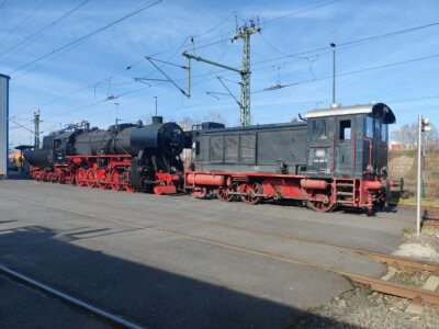 Die Vorbereitungen zur Hauptuntersuchung unserer Dampflok 52 4867 sind in vollem Gange! Die Lok wurde zur Grundreinigung und abschließenden Befundung durch den Eisenbahn-Sachverständigen mit unserer Diesellok 236 406-5 in die Werkstatt der VIAS nach Frankfurt-Griesheim geschleppt.