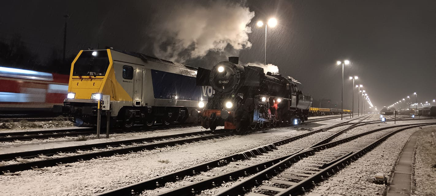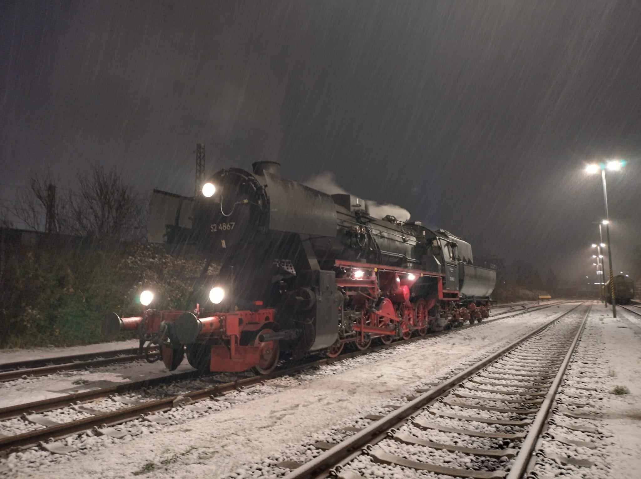 Doch die Arbeit hat sich gelohnt: So konnte gestern 52 4867 erfolgreich angeheizt und probegefahren werden und alles scheint so zu funktionieren wie es soll, sodass den Adventsfahrten nichts mehr für 52 4867 im Weg steht. Wie lange es wohl her sein mag, dass die Lok frischen Schneefall auf ihrem Kessel spürte? 🙂