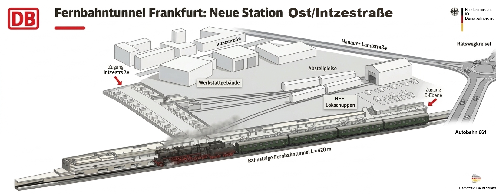 Wie bereits im 5. Dialogforum bekanntgegeben, ist es erklärtes Ziel der DB InfraGO und der Stadt Frankfurt, unseren Verein mit der Station „Frankfurt-Ost/Intzestraße“ in das Projekt einzubinden. Hierdurch werden auch zukünftig historische Schienenfahrten in Frankfurt möglich sein. Zugleich dient die direkte Anbindung zum Vorhalten unserer Diesel-, und Dampflok in Notfällen im Tunnel, um z.B. stromunabhängig liegengebliebene Züge abzuschleppen.