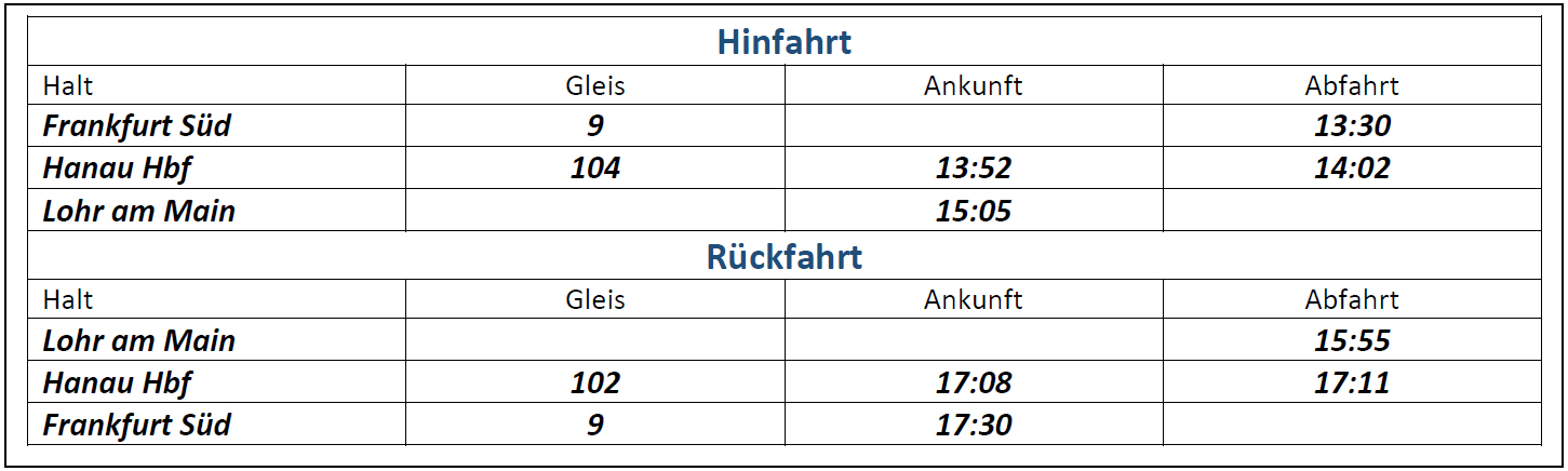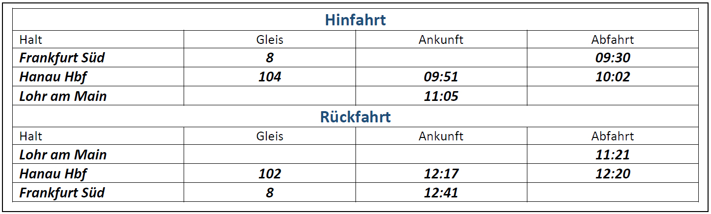 Nur noch wenige Restkarten verfügbar! Ein weiterer Wagen wurde im Vorverkauf freigegeben, somit sind wieder Plätze in unserem Sonderzug buchbar. Details zur Sonderfahrt Am 25. Mai 2017 begeht die Historische Eisenbahn Frankfurt e.V. ab Frankfurt (M) den Abschied der bekannten Spessartrampe zwischen Laufach und Heigenbrücken. Dieser Streckenabschnitt wird zum 15. Juni 2017 außer Betrieb genommen und durch eine Neubaustrecke ersetzt. Der Sonderzug startet einmal vormittags und ein weiteres Mal nachmittags ab Frankfurt Süd. Nach einem Zustiegshalt in Hanau Hbf fährt der Zug nonstop im Eilzugtempo über Aschaffenburg nach Laufach, ab hier befahren wir die Spessartrampe und durchfahren den Schwarzkopftunnel. Danach passieren wir den Bahnhof Heigenbrücken und setzen unsere Fahrt über die Main-Spessart-Bahn bis Lohr am Main fort. In Lohr am Main wird nach einem kurzem Aufenthalt die Fahrtrichtung geändert und es geht auf demselben weg wieder zurück nach Frankfurt-Süd. Zum Einsatz kommen 01 118 und E94 088 der GES Stuttgart.