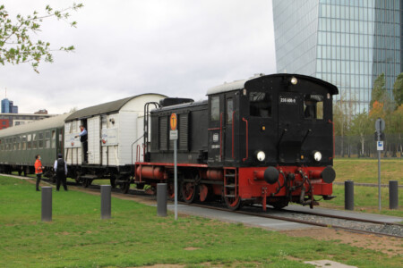 Geniesen Sie die Fahrt über die Hafenbahn entlang des Main-Ufers. Zum Einsatz kommen unsere historischen Reisezugwagen, gezogen bzw. geschoben von unserer Diesellok 236 406-5 sowie einer modernen Diesellok der HFM.